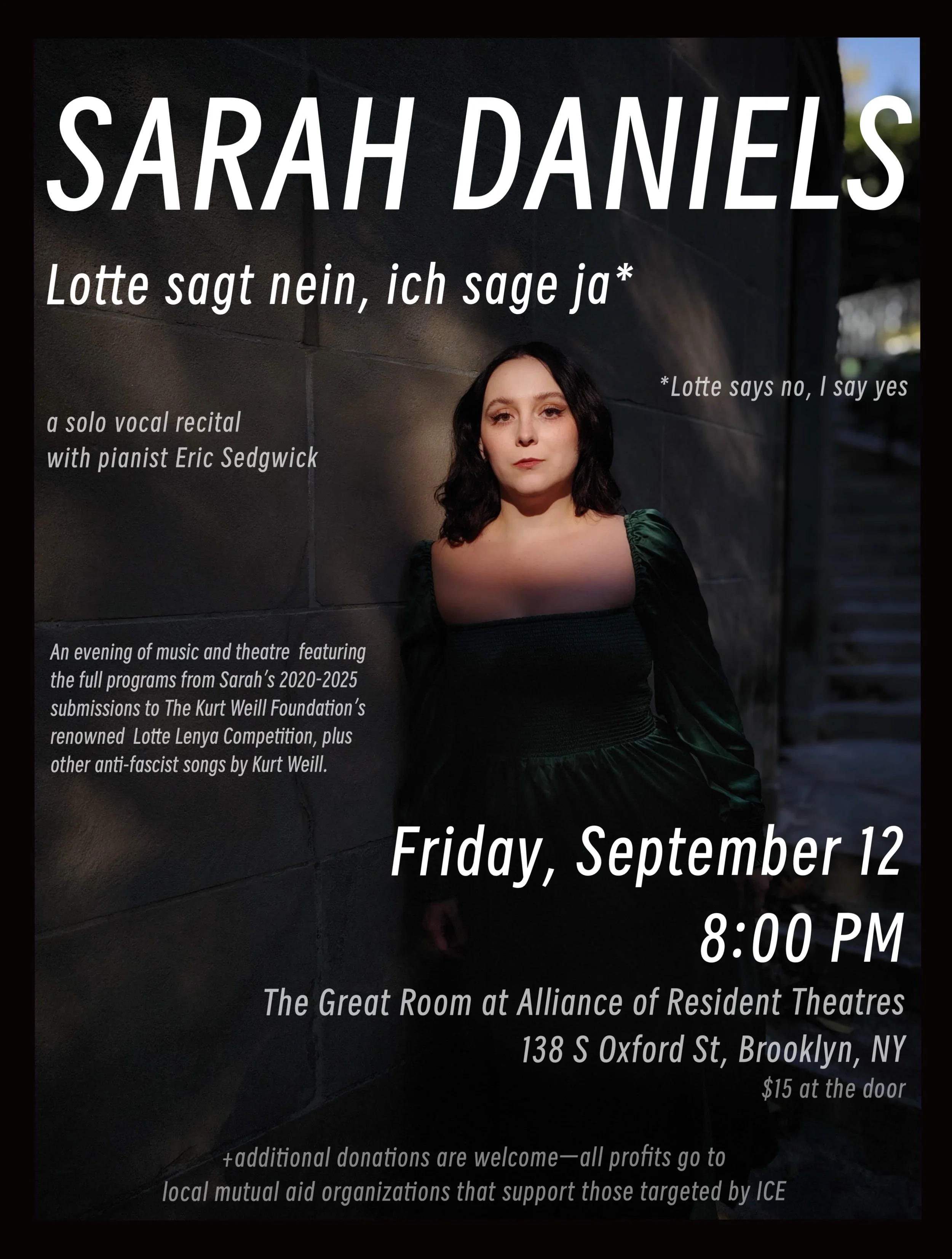 Sarah Daniels presents her first solo vocal recital since 2016 in this exciting collaboration with pianist Eric Sedgwick. The title Lotte sagt nein, ich sage ja or “Lotte says no, I say yes” is a direct reference to the fact that Sarah was never able to advance past the video round of The Kurt Weill Foundation’s renowned Lotte Lenya Competition, and has since aged out of competing. After hundreds of hours of work on the songs and arias submitted to this competition, Sarah decided it is time to present all of this carefully curated programing to a live audience for the first time. The timing of this recital also happens to coincide with America’s descent into fascism, and so the evening will not only consist of the full programs from Sarah’s 2020-2025 Lotte Lenya submissions, but other anti-fascist songs by Kurt Weill as well. In response to the current American fascist regime, this recital will function as a fundraiser as well as a protest in and of itself. Entry is $15, but additional donations are welcome, and all profits will go to local mutual aid organizations that support those targeted by ICE.