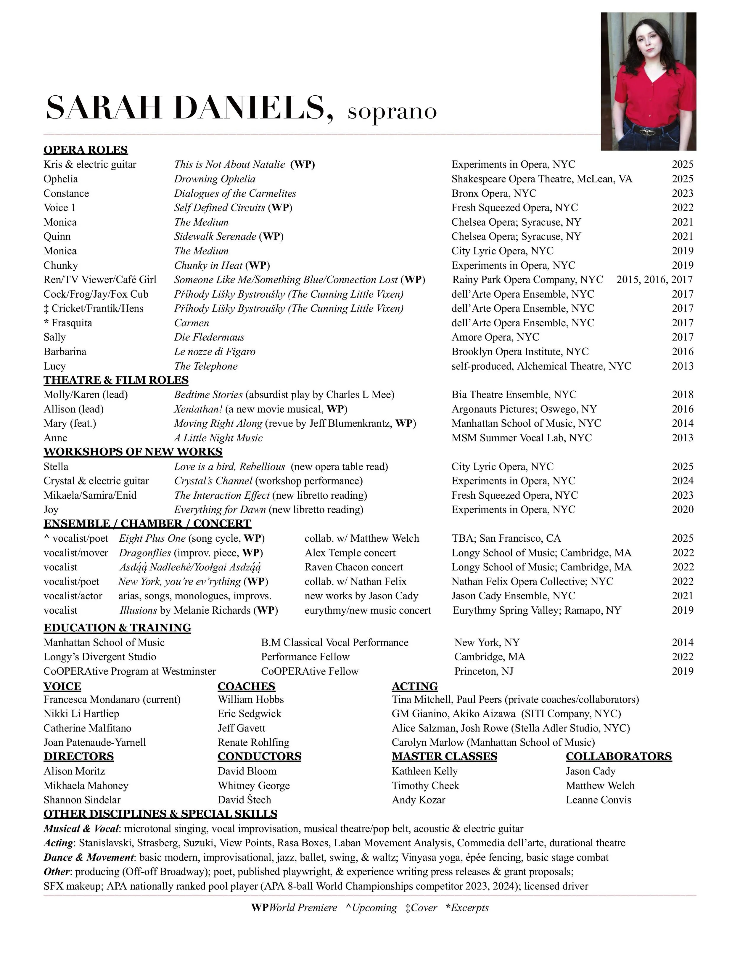 SARAH DANIELS’ RESUMÉ AS OF JULY, 2025: